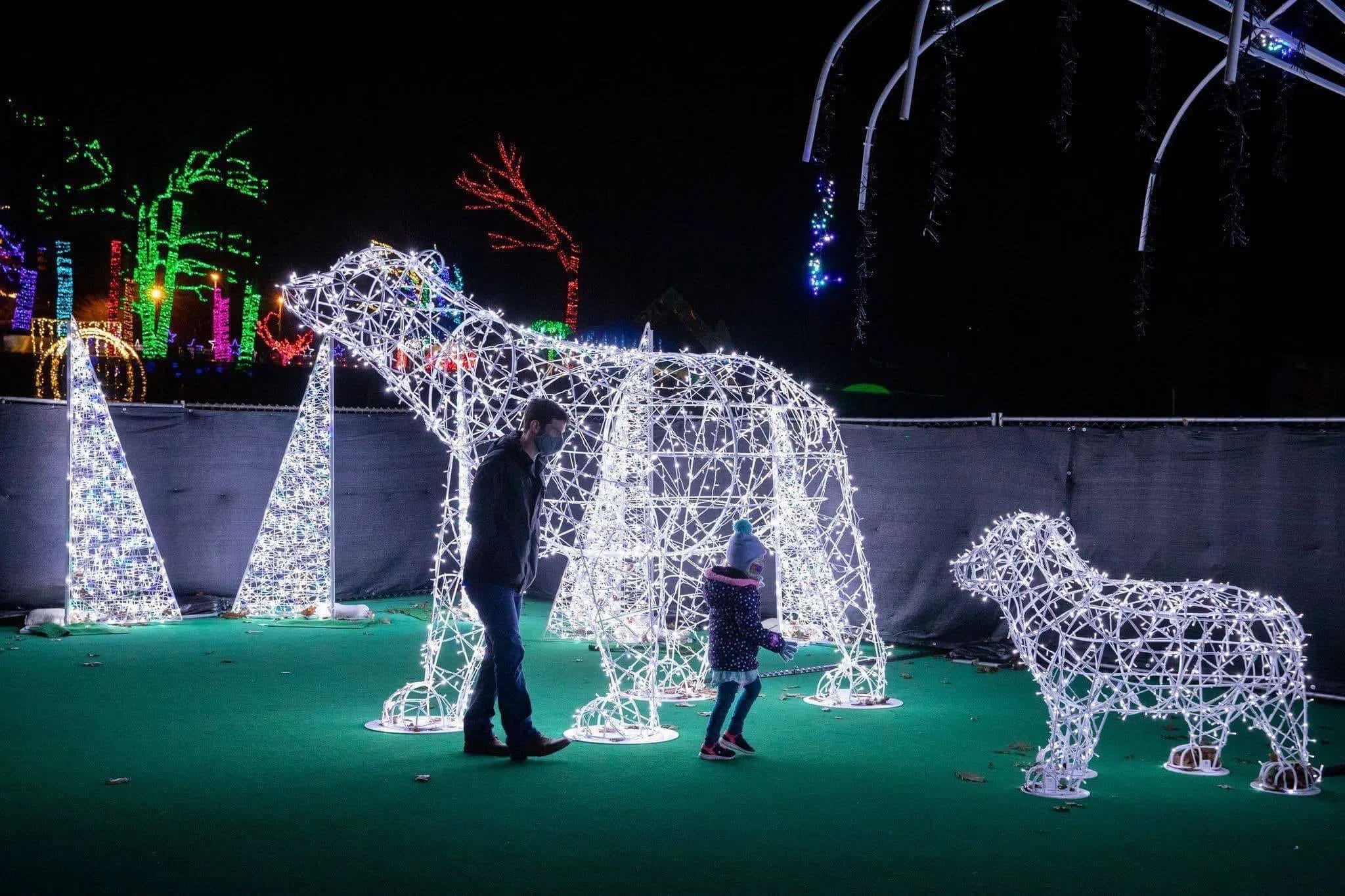 These life-size polar bears are perfect for a zoo or drive-through park winter holiday display. They are ground-mounted, made with a heavy-duty fabricated construction, along with a corrosion-resistant powder coating. Mama polar bear stands 8.5′ and baby stands 4′ tall.