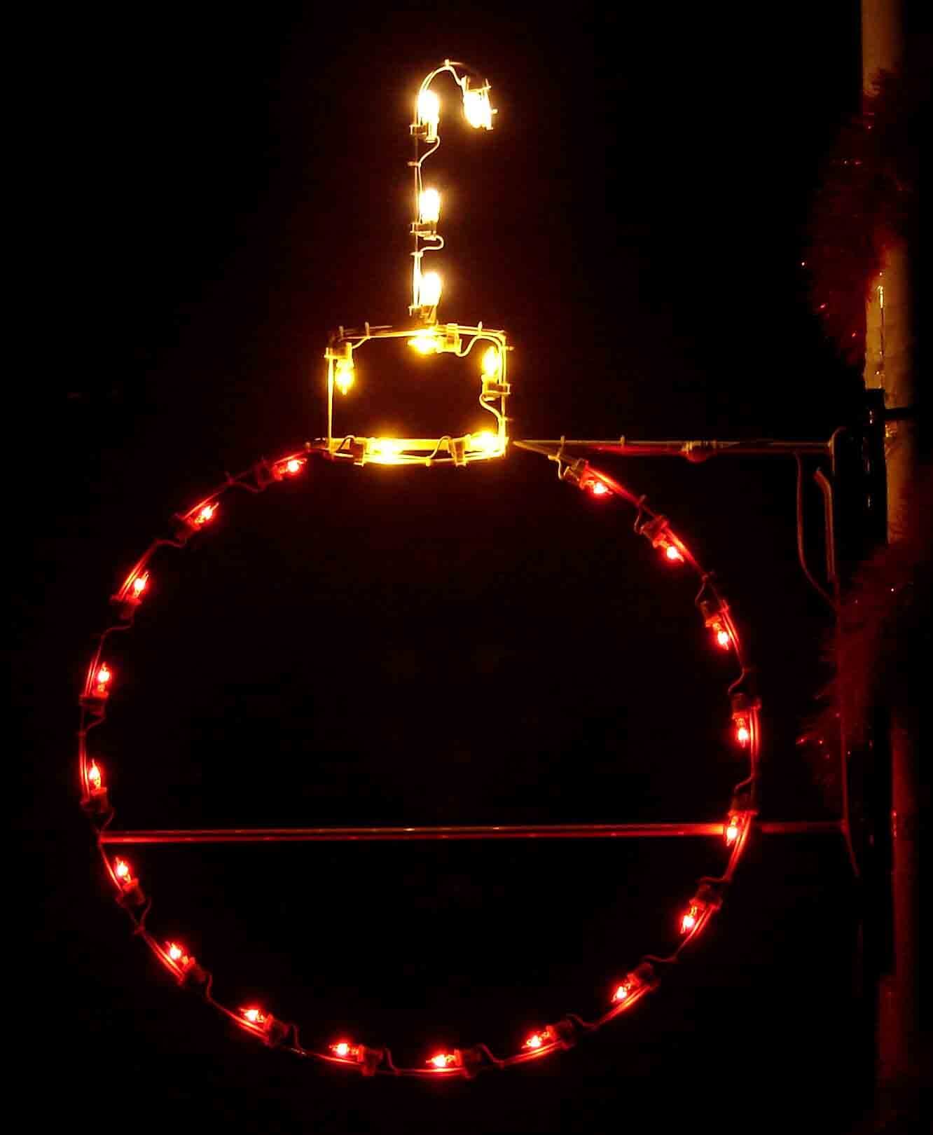 This 4′ Round Ornament With Hanger Holiday Light Display is a beautiful pole mounted display that make your holiday streets sparkle!