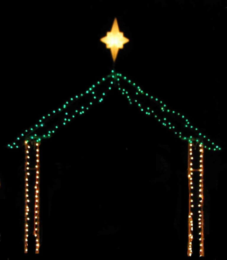 This 16-foot Ground Mounted Silhouette Stable with Star Spiritual decoration is made with a heavy-duty steel rod construction, along with a corrosion-resistant powder coating. Commercial grade wiring is then applied, which is secured by our heavy-duty clips and nylon ties.
