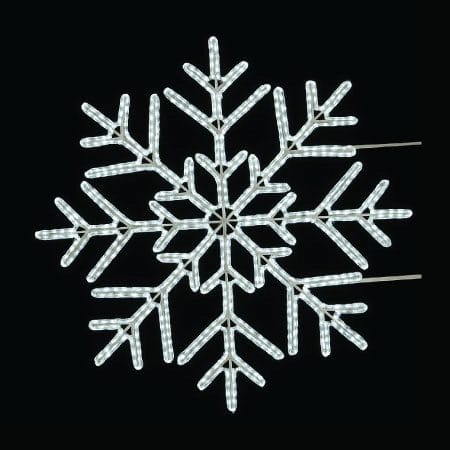 The intricate snowflake design features a bright white frame illuminated with LED rope lighting, creating a clean and highly visible display that shines beautifully both day and night. The balanced symmetry and glowing outline provide a sophisticated winter aesthetic that complements a wide variety of holiday décor themes. For additional flexibility, the display can be illuminated in warm white or cool white, allowing it to coordinate with existing lighting programs or seasonal design palettes.